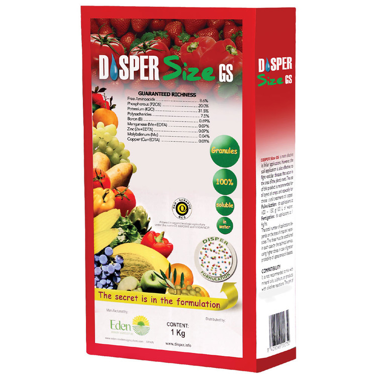 کود دیسپر سایز Disper Size GS به عنوان يك کود میکرو برای افزایش گلدهی، افزایش سایز میوه ها، بهبود دهنده و افزایش دهنده کیفیت میوه ها قابل استفاده می باشد. این ترکیب از مواد ارگانیک و معدنی تهیه شده، بدون بو و استریل شده می باشد. عناصر ریز مغذی درون این کود باعث بهبود کیفیت و کمیت محصولات می شود و همچنین اسید آمینه آن باعث افزایش مقاومت گیاهان به تنش های محیطی و آفات و بیماری ها می گردد. پلی ساکارید موجود در دیسپر سایز سبب خوش طعم شدن میوه ها می گردد. این کود از زمانی که میوه ها شروع به رشد می کنند، به صورت محلول پاشی و همراه آبیاری قابل استفاده می باشد.